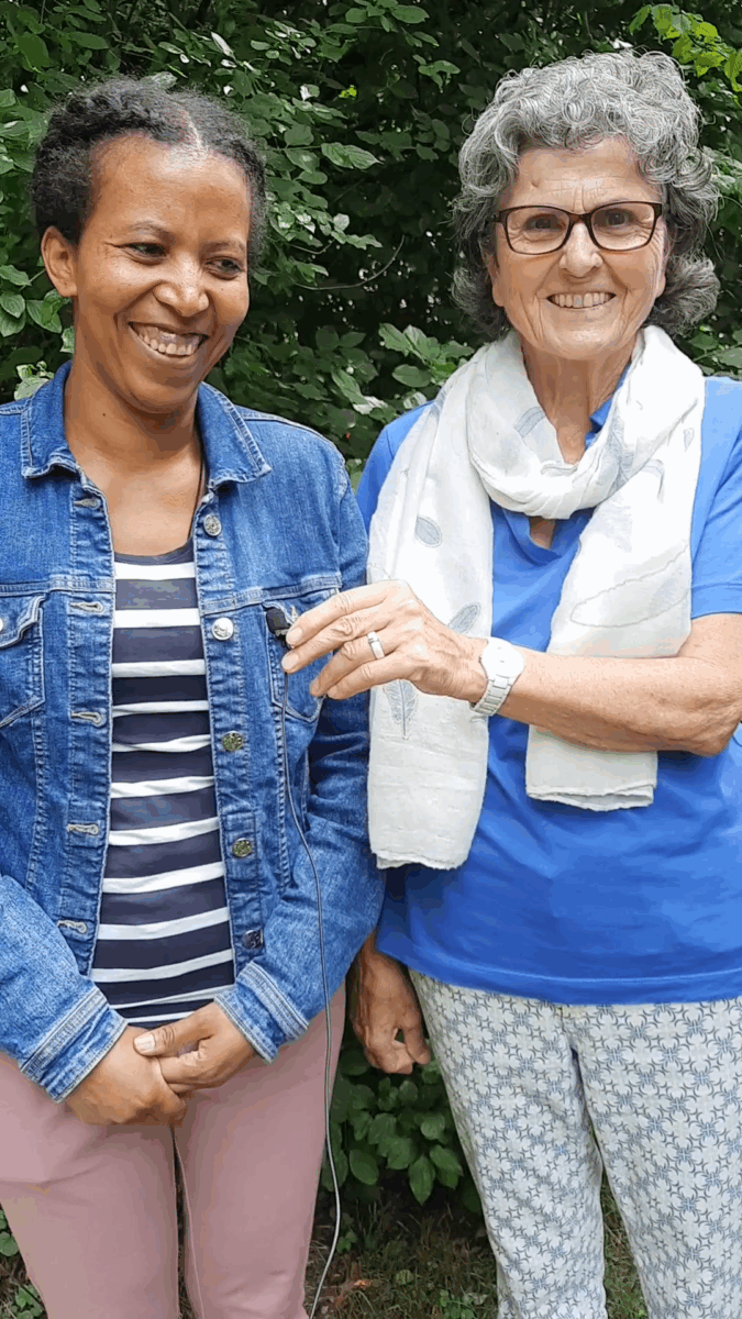 Mebrehit und Thea lernten sich durch Theas Tätigkeit in der Flüchtlingshilfe kennen und bilden seit fast zehn Jahren ein Tandem. Für Mebrehit ist Thea eine große Hilfe, da sie in Deutschland keine älteren Verwandten oder Familie hat. Mittlerweile hat sie drei Kinder zur Welt gebracht, die Thea und ihren Mann längst „Oma und Opa“ nennen. Thea empfindet große Freude daran, die Kinder in der Schule und im Leben wachsen zu sehen und zu unterstützen.